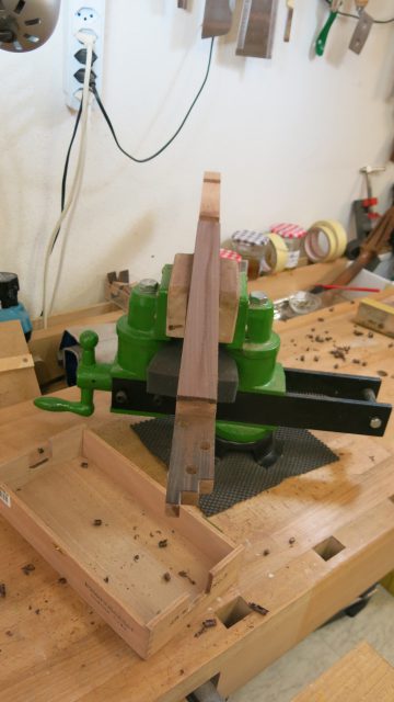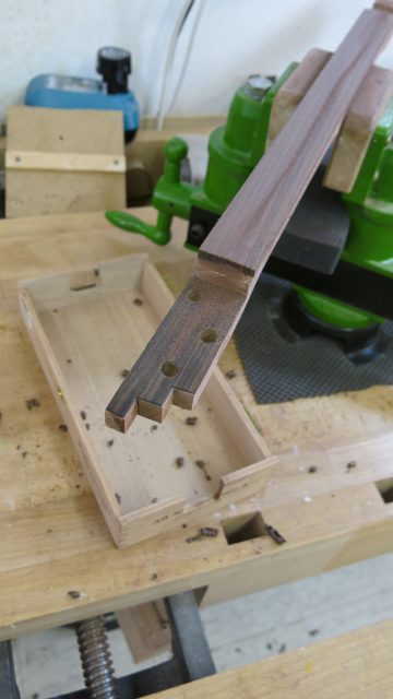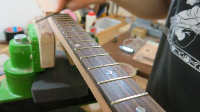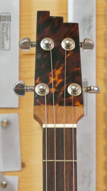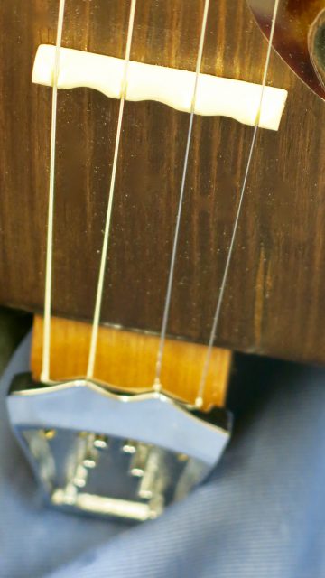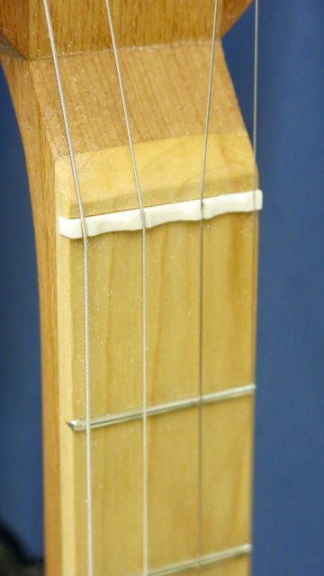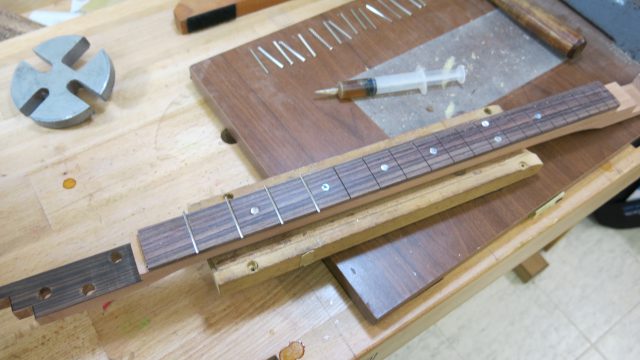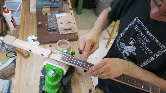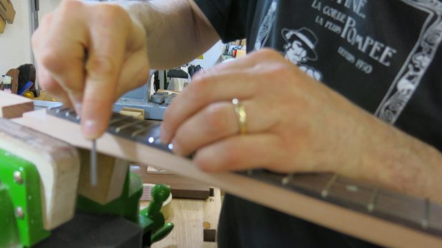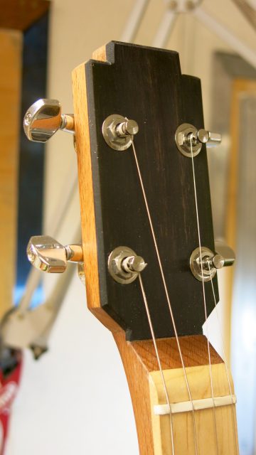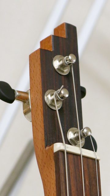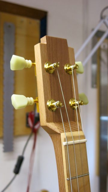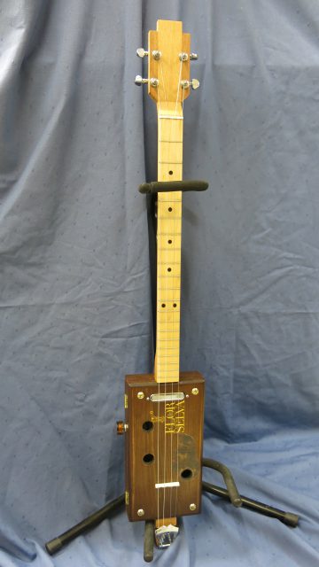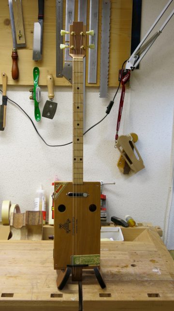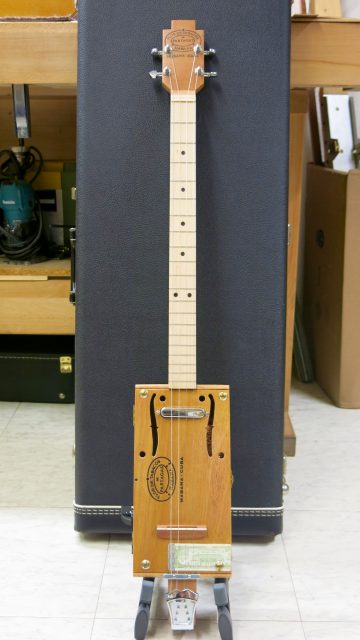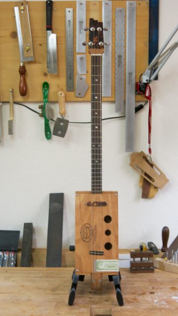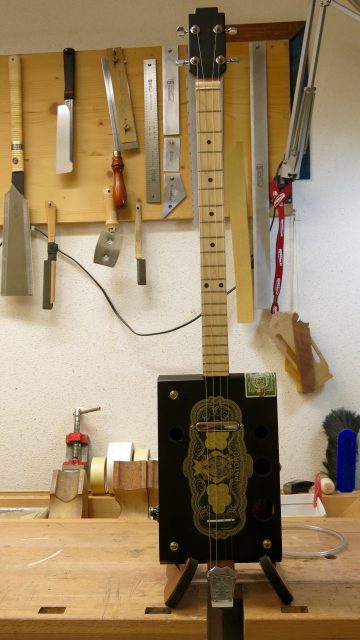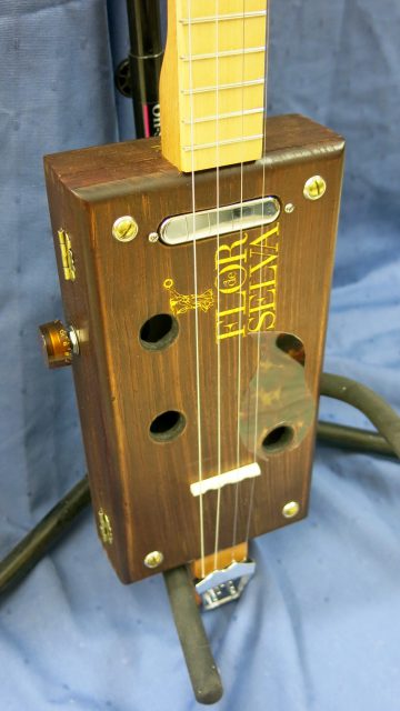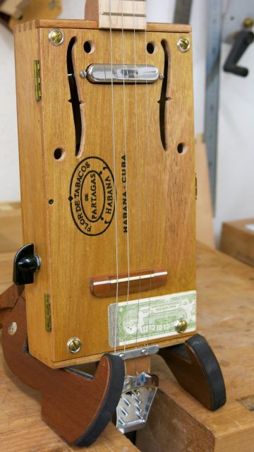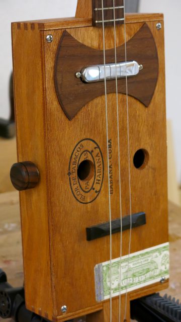 Le concept Cigar Box Guitar, consiste en un instrument de fortune à cordes, réalisé de manière artisanale avec la plupart du temps des éléments de récupération. Cet instrument est fréquemment utilisé dans le registre blues et souvent joué souvent à l’aide d’un bottleneck ou d’un slide. C’est à la suite de nombreuses demandes de modifications et réparations effectuées sur ce type d’instrument, que je me suis permis d’en changer certains paramètres de construction comme ci-dessous: Installation de vraies mécaniques, un sillet à la place d’une simple vis afin de résoudre certains problèmes d’accordage. Un chevalet dans ce cas, en ébène à la place d’une tige filetée. Une touche en palissandre frettée munie de repères en nacre. Un micro type telecaster. Certes cela peut paraître une hérésie pour les fans de cigar box de sortir du concept ”roots”, mais cela permet d’être plus confortable pour jouer.Un instrument intéressant et très addictif. Aussi simple qu’il y paraît, il vous propose une large palette sonore. L’essayer c’est l’adopter!