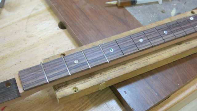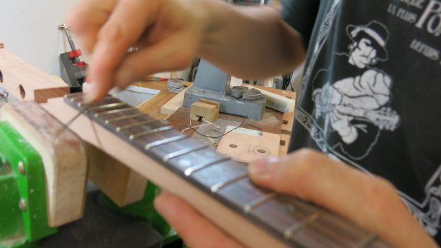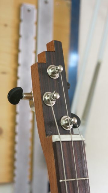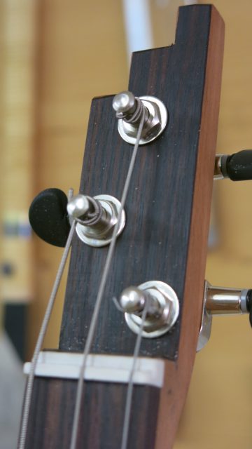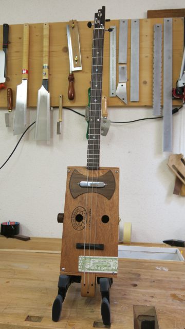 Installation de vraies mécaniques, un sillet à la place d’une simple vis afin de résoudre certains problèmes d’accordage. Un chevalet dans ce cas, en ébène à la place d’une tige filetée. Une touche en palissandre frettée munie de repères en nacre. Un micro type telecaster. Certes cela peut paraître une hérésie pour les fans de cigar box de sortir du concept  »roots », mais cela permet d’être plus confortable pour jouer.Un instrument intéressant et très addictif. Aussi simple qu’il y paraît, il vous propose une large palette sonore. L’essayer c’est l’adopter!