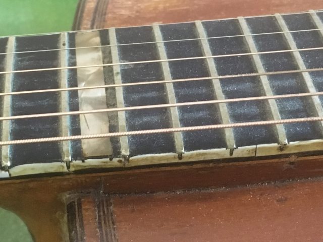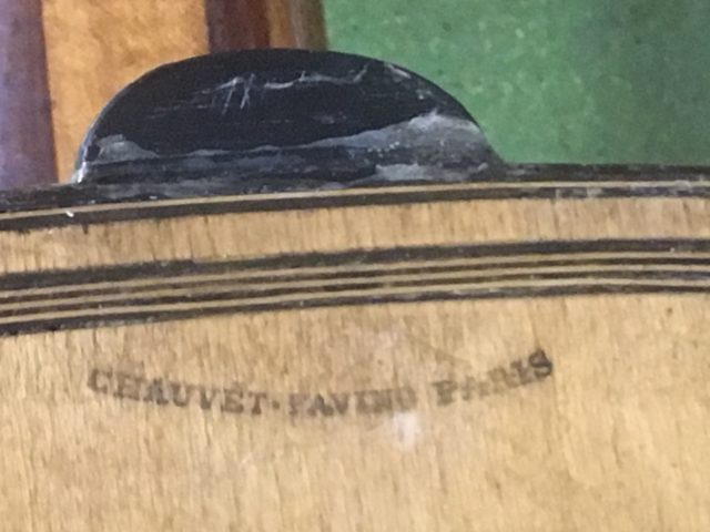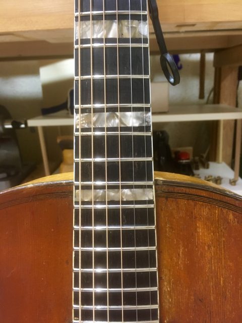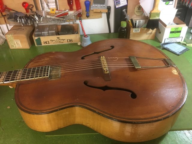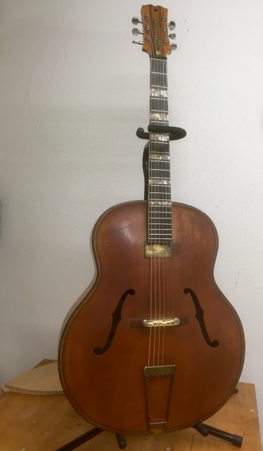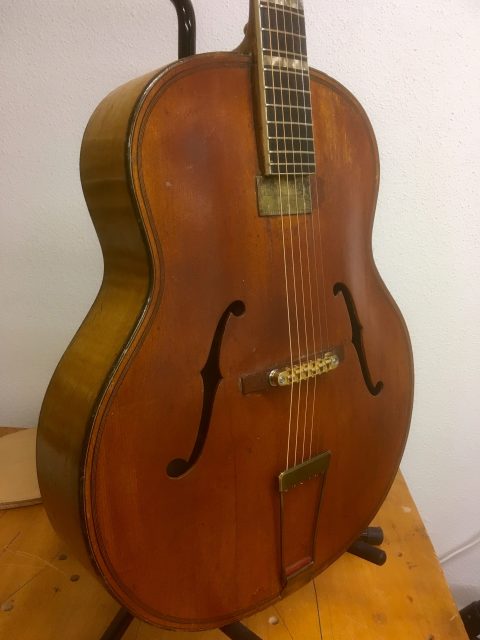 Favino, un grand nom de la lutherie Française, très connu pour ses guitares manouches. Celle-ci est d’un autre genre: une superbe jazz archtop, la No 1, année de construction 1951. Peu d’exemplaires existent. Cette guitare a été l’instrument d’un seul musicien depuis qu’elle a vu le jour. Au fil du temps, plusieurs interventions ont été réalisées, par lui et par d’autres. Comme je ne voulais pas trop toucher à sa cosmétique, qui raconte son histoire et fait son charme, j’ai préféré simplement la rendre à nouveau jouable. Un frettage complet a été plus que nécessaire, tout comme un redressage de la touche. J’ai également restauré les repères de touche, qui étaient en celluloïd et non pas en nacre, comme c’est plus souvent le cas. Le filet de touche, en triste état, a lui aussi dû être changé.
