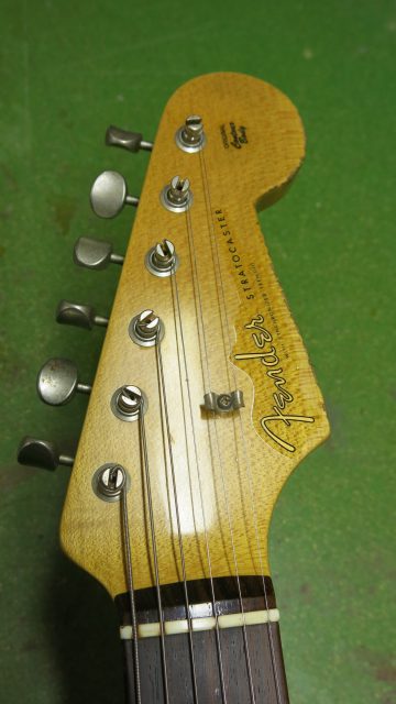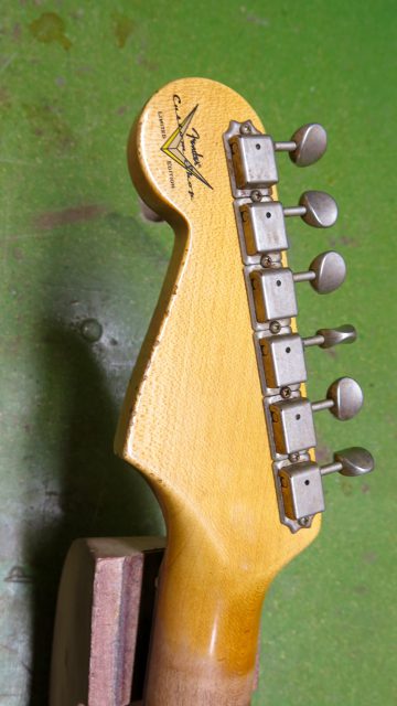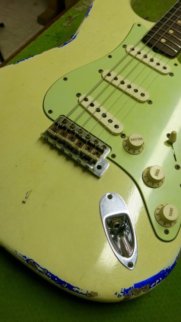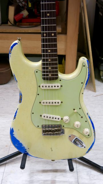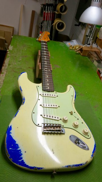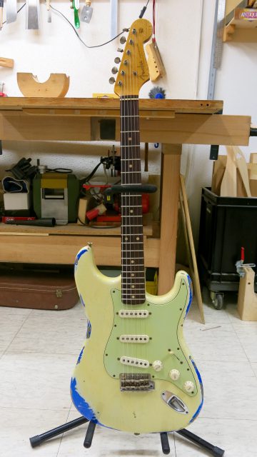 Fender Stratocaster Custom Shop 60s, mais avec un pré-ampli actif type Eric Clapton. Les travaux effectués sont les suivants: réglage complet, manche, intonations, vibrato, équilibre des micros, polissage des frettes, nettoyage et entretien de la touche… tout ce qui est nécessaire pour avoir un instrument plus confortable.