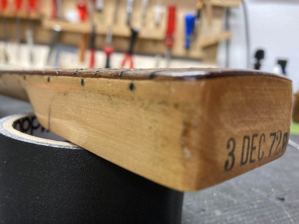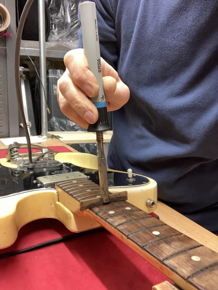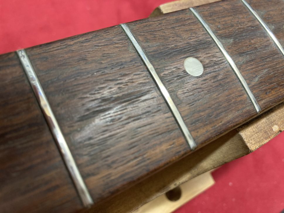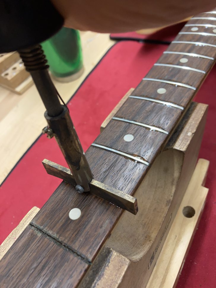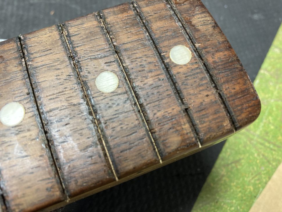 Pour rester au plus près de l’originalité de l’instrument, j’ai commencé par remettre à niveau la touche, aussi loin que son état le permettait. Ensuite, j’ai procédé à un frettage complet, en ajustant les pieds de chaque frette de manière à ce qu’elles exercent la pression nécessaire sur le manche – quitte à le rendre un peu concave, et corriger ensuite si nécessaire. C’est l’habitude des restaurations d’instruments anciens sans tige de réglage, notamment les nombreuses mandolines sur lesquelles j’ai travaillé, qui m’a convaincu de choisir cette technique. Cette option ne garantit pas de certitudes, mais elle m’a semblé nécessaire pour garder l’instrument aussi original que possible.