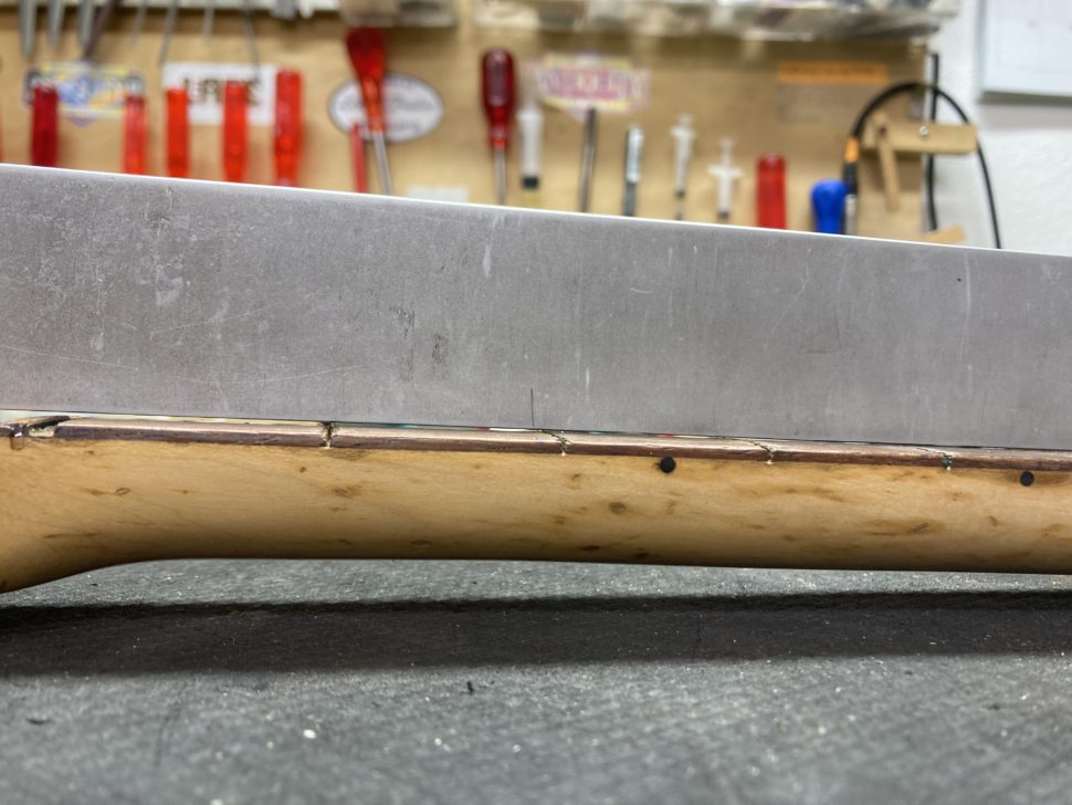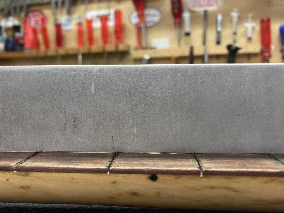 Malheureusement, à y regarder de plus près, le gros du problème se situait au niveau du manche, plus précisément de la touche. Cette dernière était extrêmement fine et très irrégulière. Le manche, lui, était à la limite d’être convexe, malgré une tige de réglage (truss rod) détendue au possible.