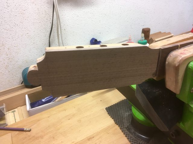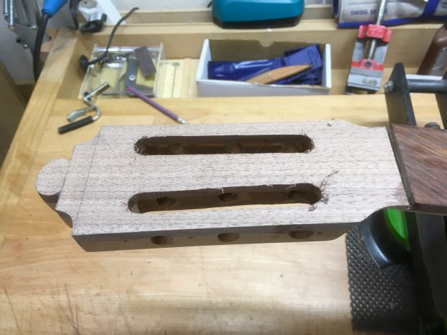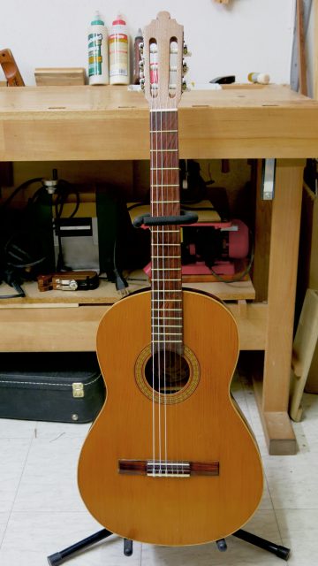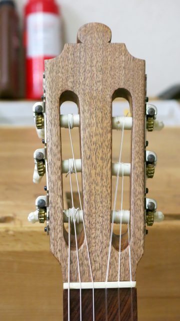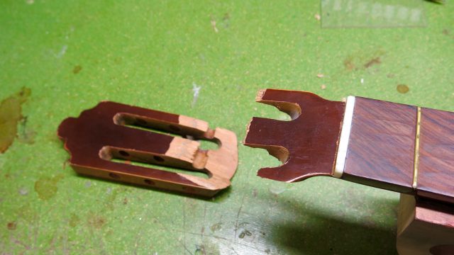 Le collage de tête de guitare est quelque chose que l’on me demande très fréquemment. Il est toutefois intéressant de constater que malgré un travail presque routinier, chaque intervention demande une approche différente. Pour cette guitare, il a fallu remplacer la plaque de tête en y insérant des renforts sous celle-ci sans quoi, la résistance et l’esthétique n’auraient pas été au rendez-vous. Chaque instrument mérite un soin particulier quelle qu’en soit sa valeur.