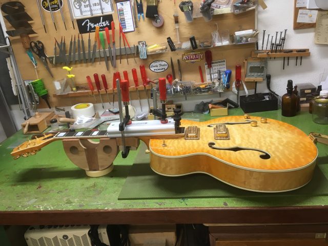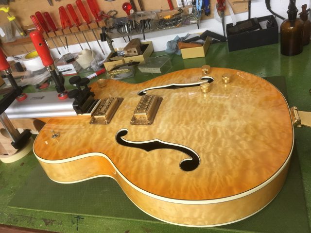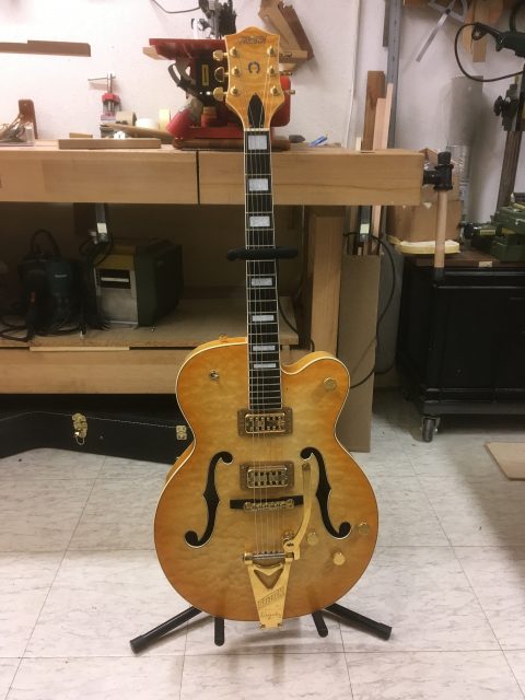 Sur cette Gretsch 6120, je n’ai pas effectué de grosse intervention. Un frettage partiel ainsi qu’un bon réglage. Une Gretsch, c’est un monde à part, un Bigsby, c’est une autre dimension. Celui-ci, une fois correctement ajusté devient redoutable et bien plus polyvalent qu’il n’y paraît.