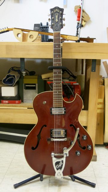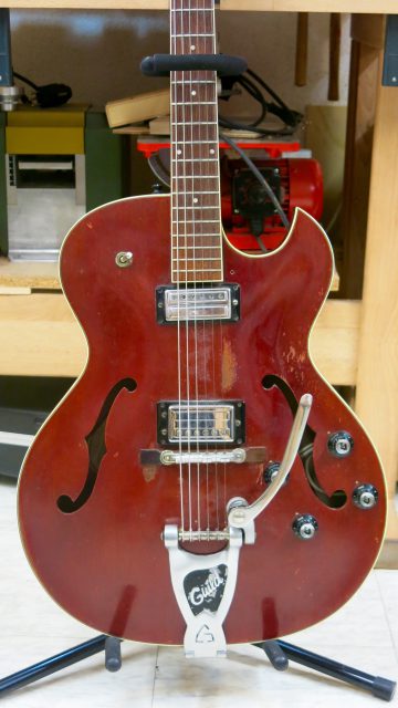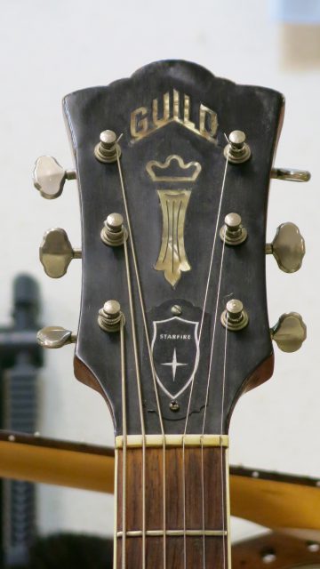 Guild Starfire 1967, pas de grandes interventions. Façonnage d’un nouveau sillet de tête sur mesure, ressoudé une partie de l’électronique et réglage.