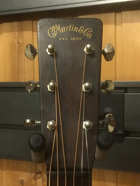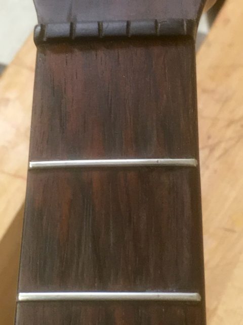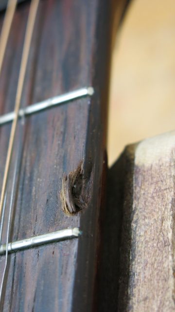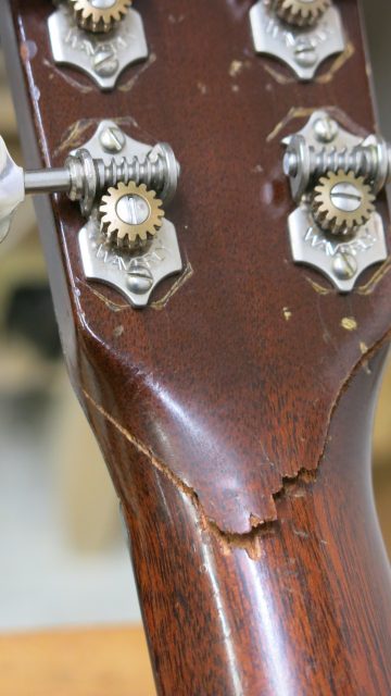Cette Martin 0017 de 1952 m’a été confiée après avoir été percutée par une voiture. Heureusement sans gravité pour son propriétaire, l’accident a provoqué quelques dégâts sur l’instrument: une fracture de tête, un enfoncement au bas de la caisse et sur l’éclisse, ainsi qu’un important impact sur la touche. La restauration de cette dernière a été très intéressante. Après avoir trouvé LA pièce idéale dans mon stock de bois, j’ai procédé à une greffe de palissandre, effectuée entre les deux premières frettes. J’ai ensuite prodigué une légère usure à la zone pour qu’elle se marie bien à l’ensemble de la guitare. Munie ensuite d’une tête et d’une éclisse recollées, cette superbe Martin fut prête à reprendre la route.