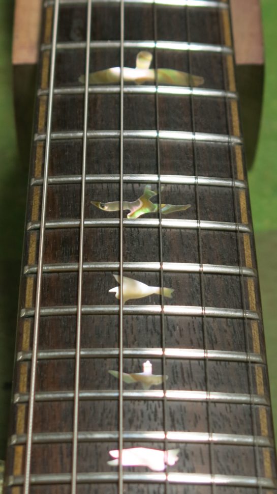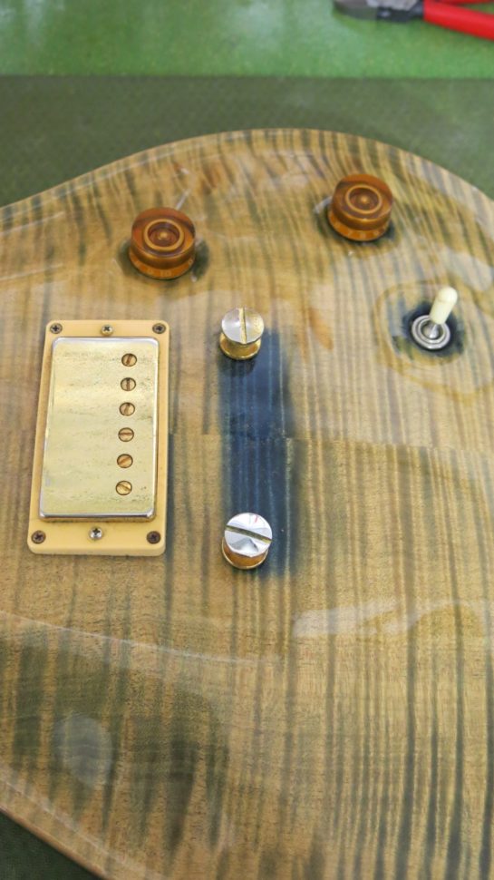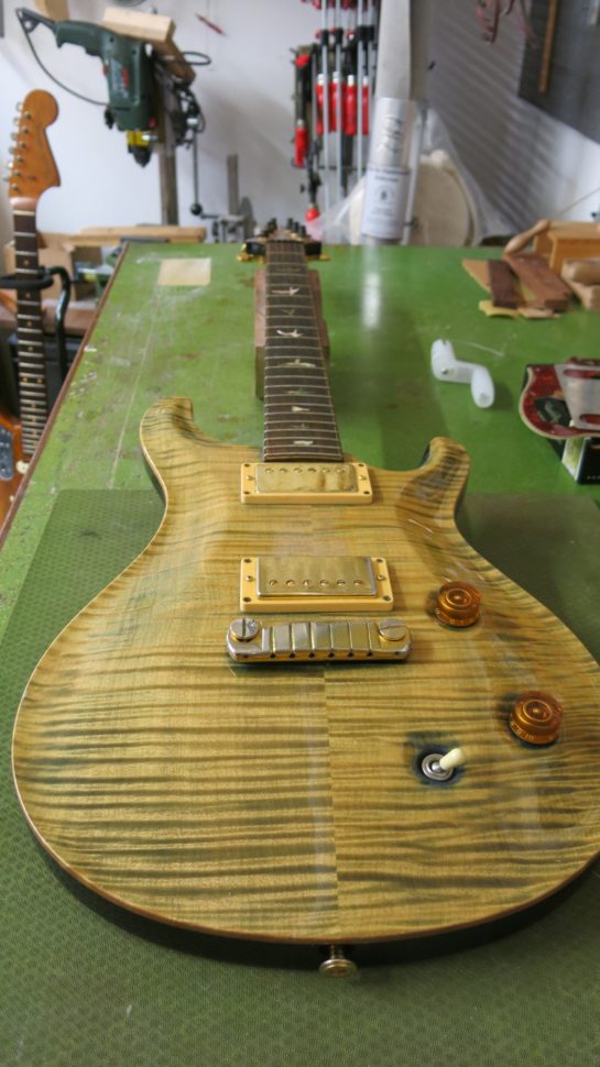 NB : l’ancien propriétaire de cette guitare est loin d’être un débutant, bien au contraire. Il possède une grande connaissance du travail du bois et de la technique des vernis. Il n’est d’ailleurs jamais avare en petits secrets, qu’il me divulgue volontiers lors de nos entrevues. Sans oublier sa passion sans fin pour le bois et les belles guitares. Merci Daniele