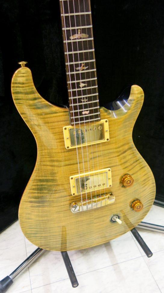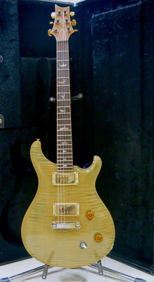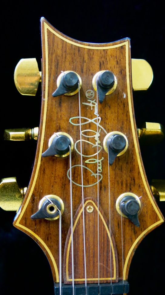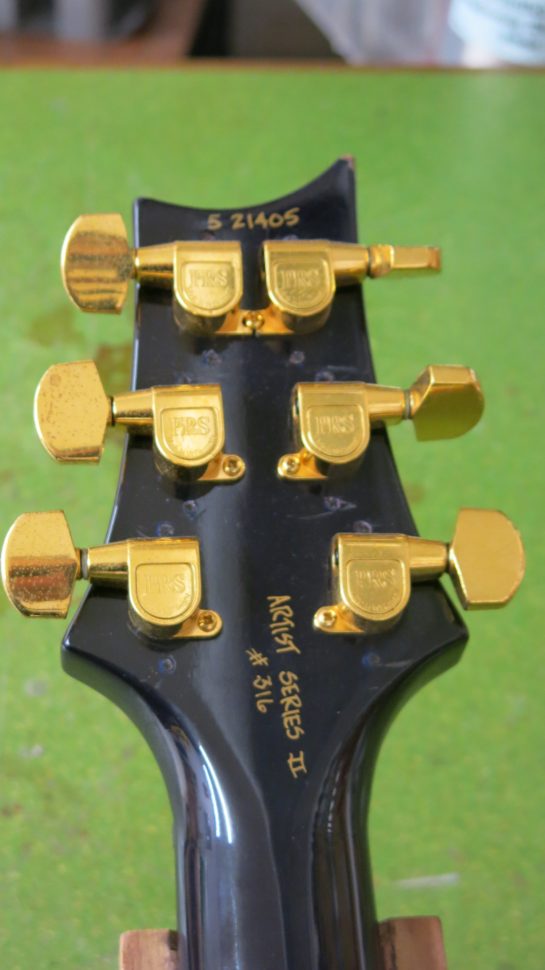 Voici une bien belle PRS Artist. C’est grâce à un petit passage sous une lampe UV que son propriétaire a soumis cette guitare à son changement de pigmentation. Sous les rayons, l’instrument est passé du bleu indigo à une couleur qui défie la description. Peut-être que seul PRS pourrait la nommer ? Dans tous les cas, le traitement ne manque pas d’idée, ni de charme. Surtout, il n’a en rien gâché les qualités musicales de l’instrument. Au-delà de sa petite séance d’UV, la guitare méritait une remise en route et un bon refrettage.