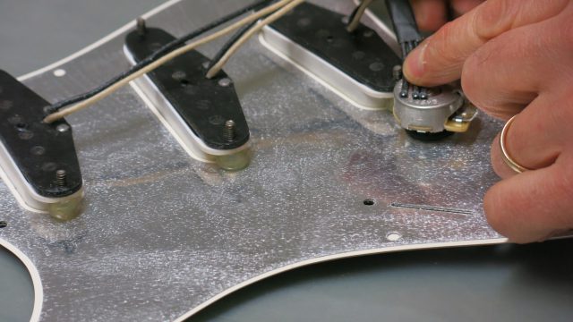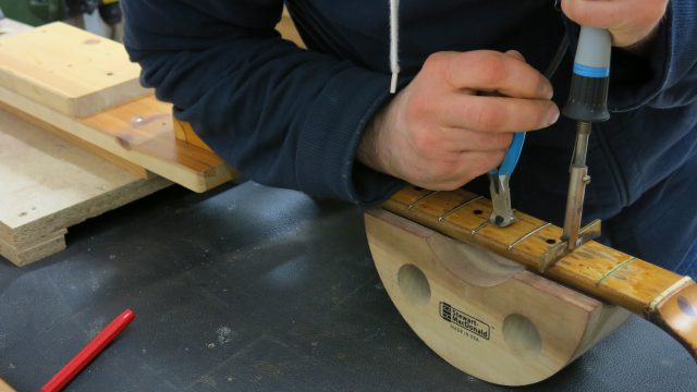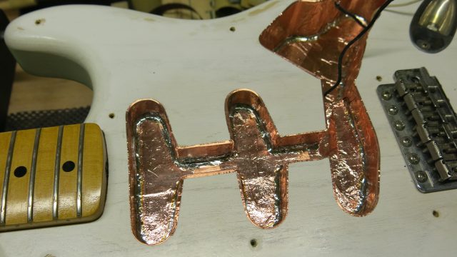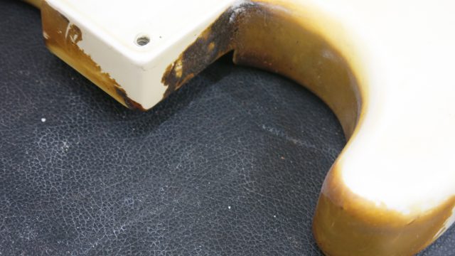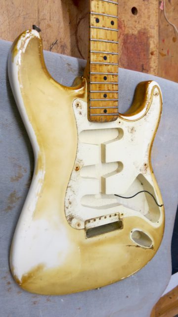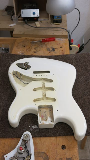 Quand cette Fender stratocaster d’une trentaine d’années m’a été confiée, elle avait subi une finition »relic, faux-vieux », mais malheureusement celle-ci n’avait pas été réalisée avec le soins qu’elle méritait. Son propriétaire m’a donc demandé de retirer ce faux vintage, afin de retrouver sa couleur d’origine, olympic white. Les frettes étaient très fatiguées, un refrettage a été plus que nécessaire. Pour le manche, j’ai fais en sorte de laisser des marques d’usure et la finition originale afin de lui laisser son touché soyeux, si agréable que l’on trouve sur les anciennes guitares. Il a fallu aussi refaire correctement l’électronique avec des composants de meilleure qualité et réaliser un blindage des cavités ainsi qu’un bon réglage.
