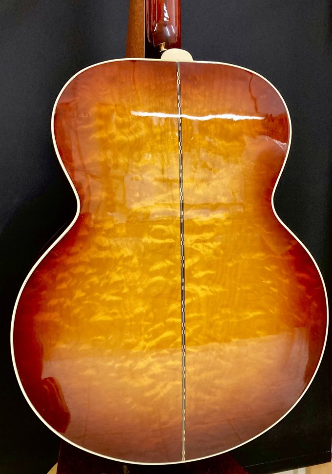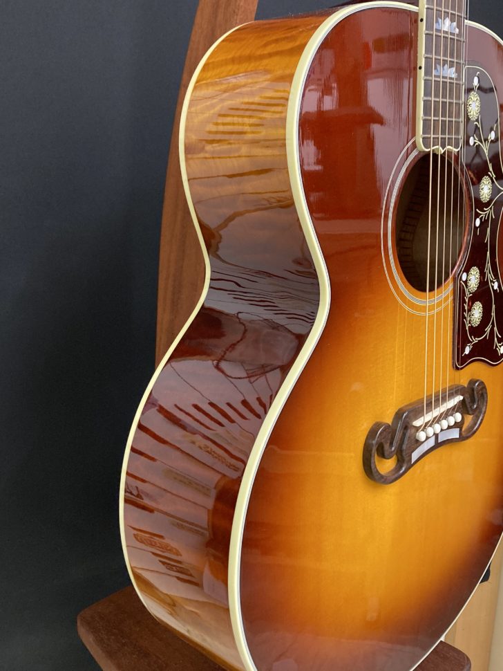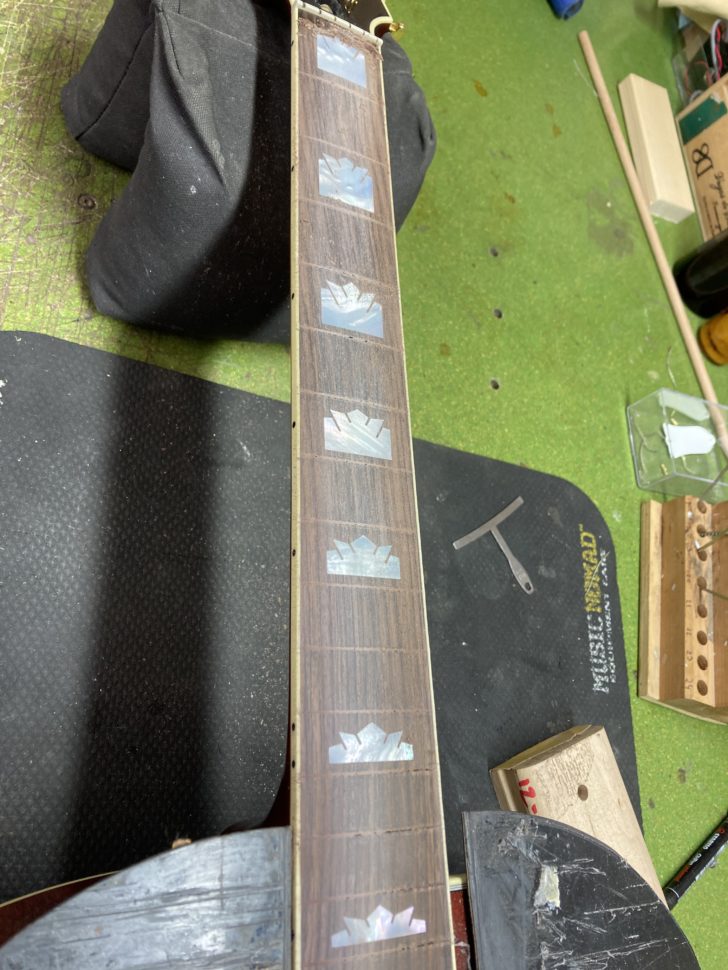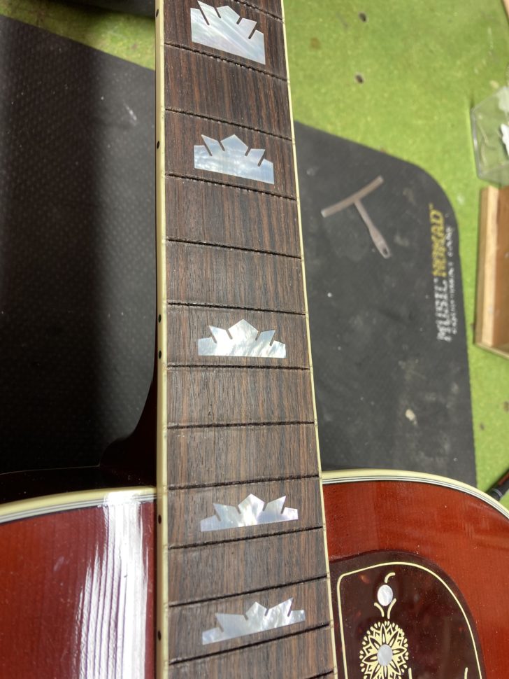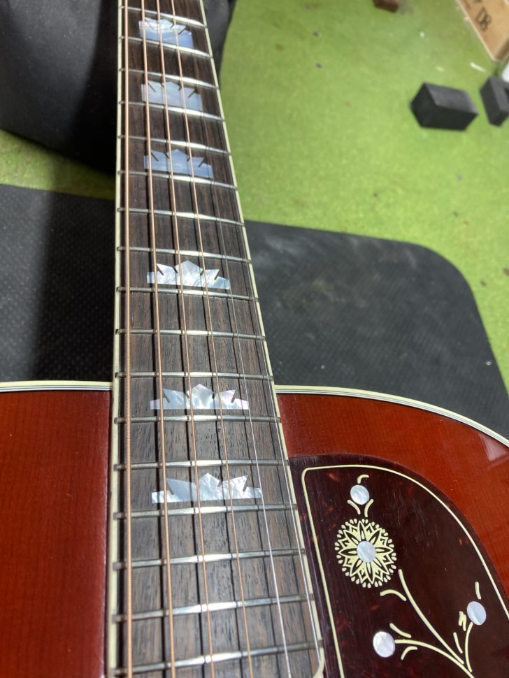 Cette guitare Gibson SJ200 de magnifique facture a eu besoin d’un refrettage ainsi que d’une planimétrie de la touche.