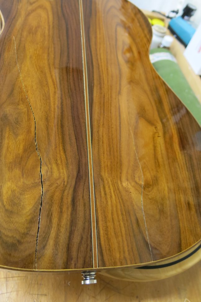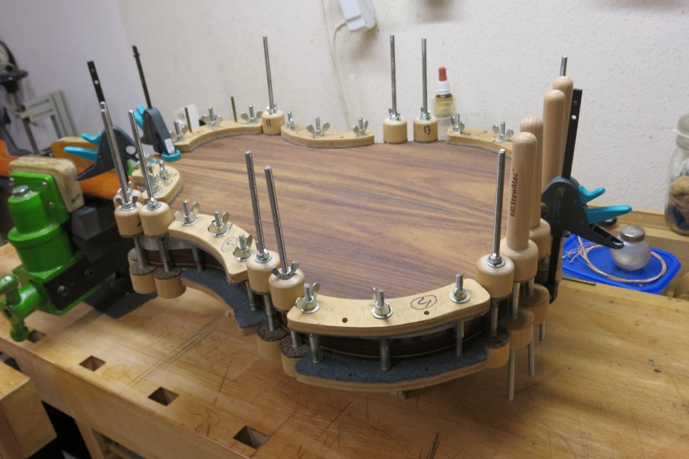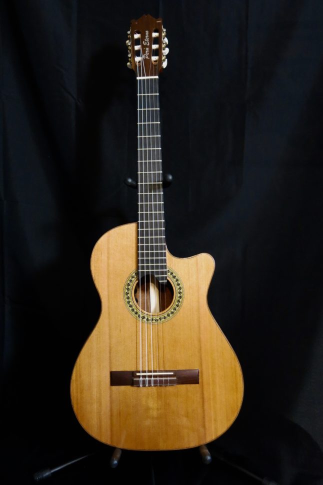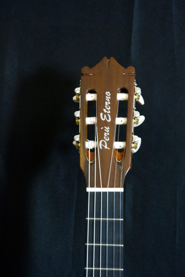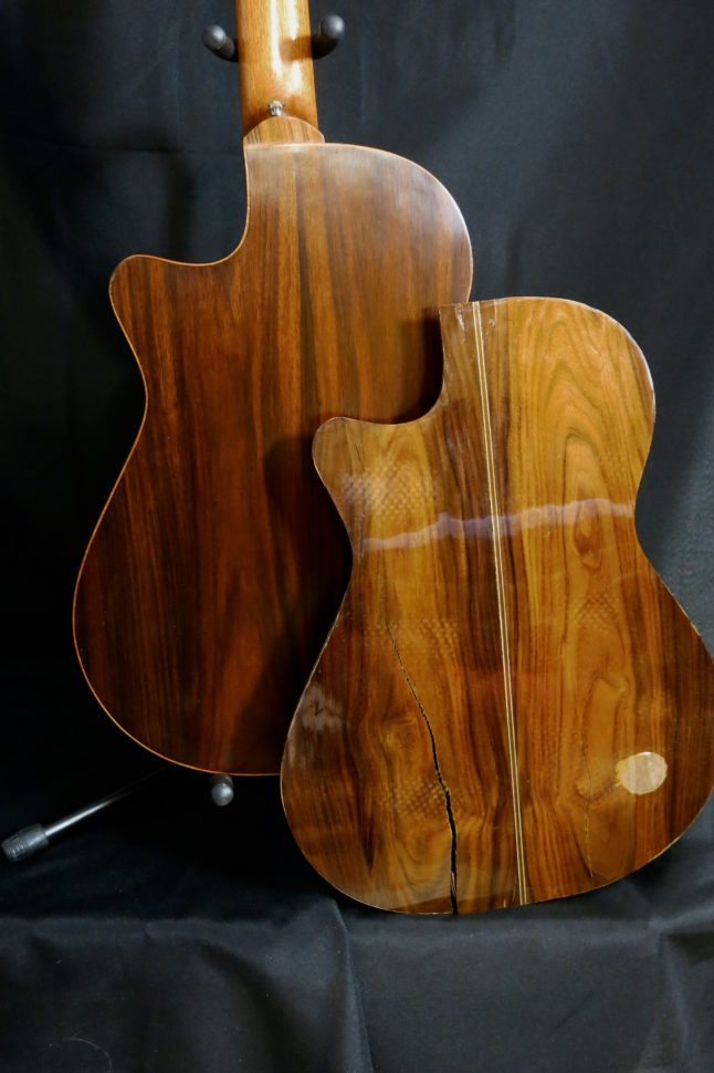 Cette guitare de fabrication péruvienne a subi une importante fracture du dos. Comme ce dernier était malheureusement difficilement réparable en l’état, il a fallu lui en confectionner un nouveau. Pour réaliser cette intervention, plusieurs petits chantiers, invisibles de l’extérieur, ont été entrepris. Il a notamment fallu s’attaquer aux barrages intérieurs du dos : chacune de ces barres possède un certain galbe, des épaisseurs spécifiques, de même que des hauteurs différentes qui contribuent au son de l’instrument et qui donne au dos sa voûte visible de l’extérieur. Les contre-éclisses ont également été remplacées. Ces petits morceaux de bois taillés en biseau, collés sur le pourtour de la guitare, ont pour fonction d’augmenter la surface de contact entre le dos, la table et les éclisses. Puis est venu le tour de la fileterie. Cette dernière a pour fonction de protéger les arrêtes de l’instrument des coups. Elle amène aussi une touche esthétique. Les filets peuvent être en plastique ou en bois. Dans ce cas, j’ai employé du bois de noyer. Enfin, pour bien se remettre de sa grosse fracture, cette guitare méritait aussi qu’on l’habille avec douceur et élégance : je lui ai concocté un vernis à la gomme-laque satinée, que j’ai appliqué au tampon.