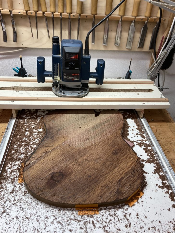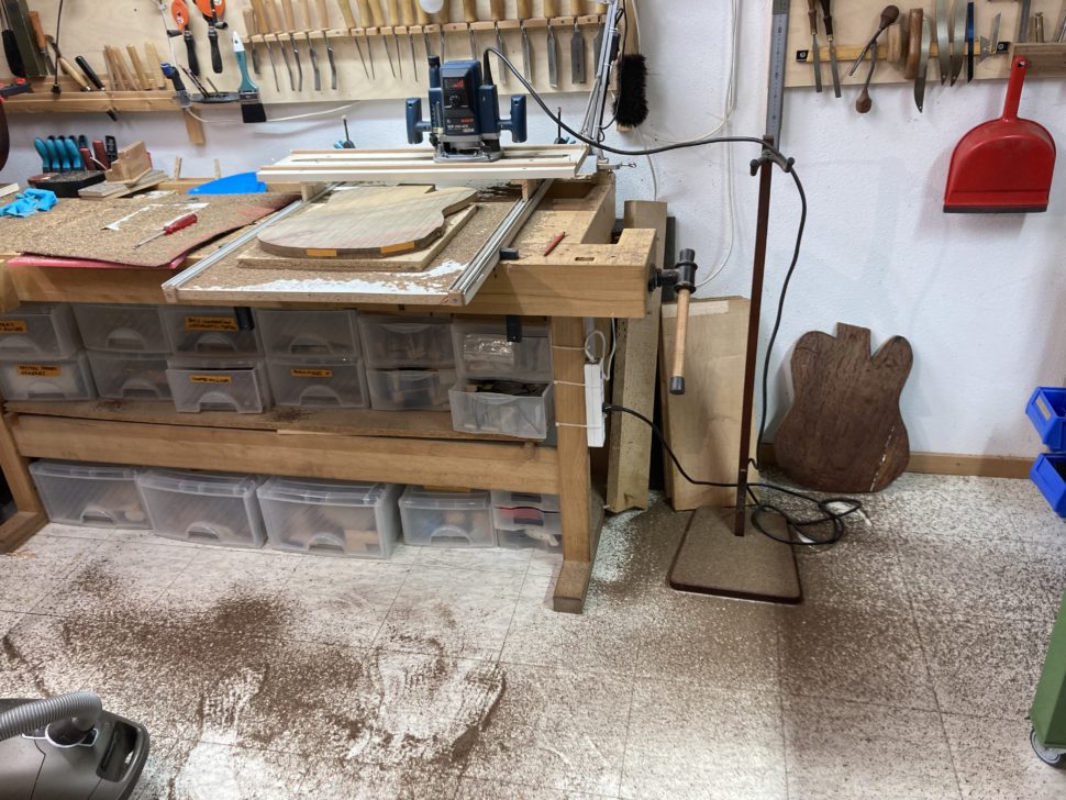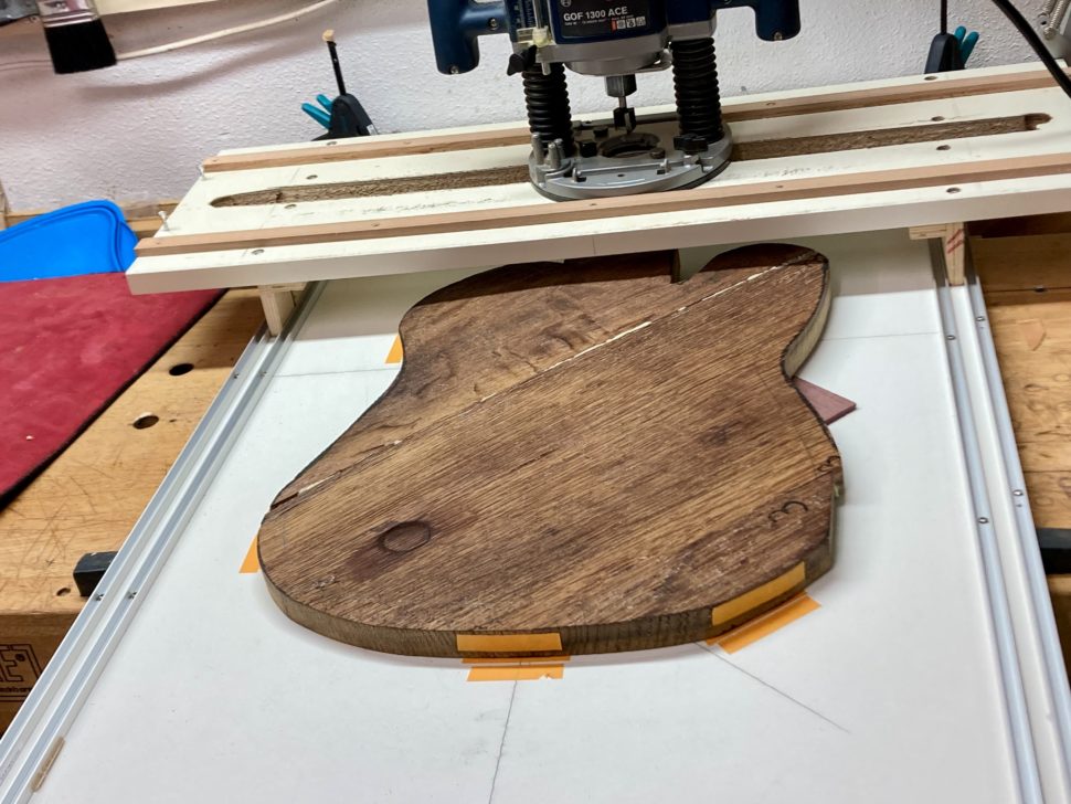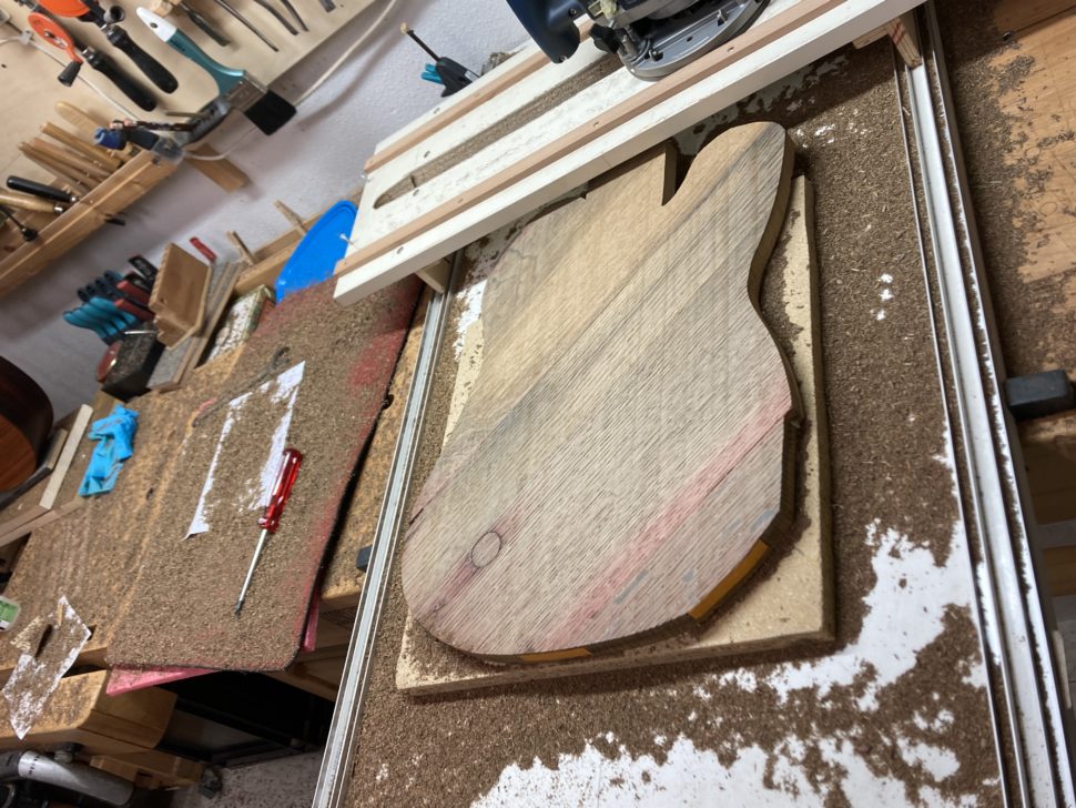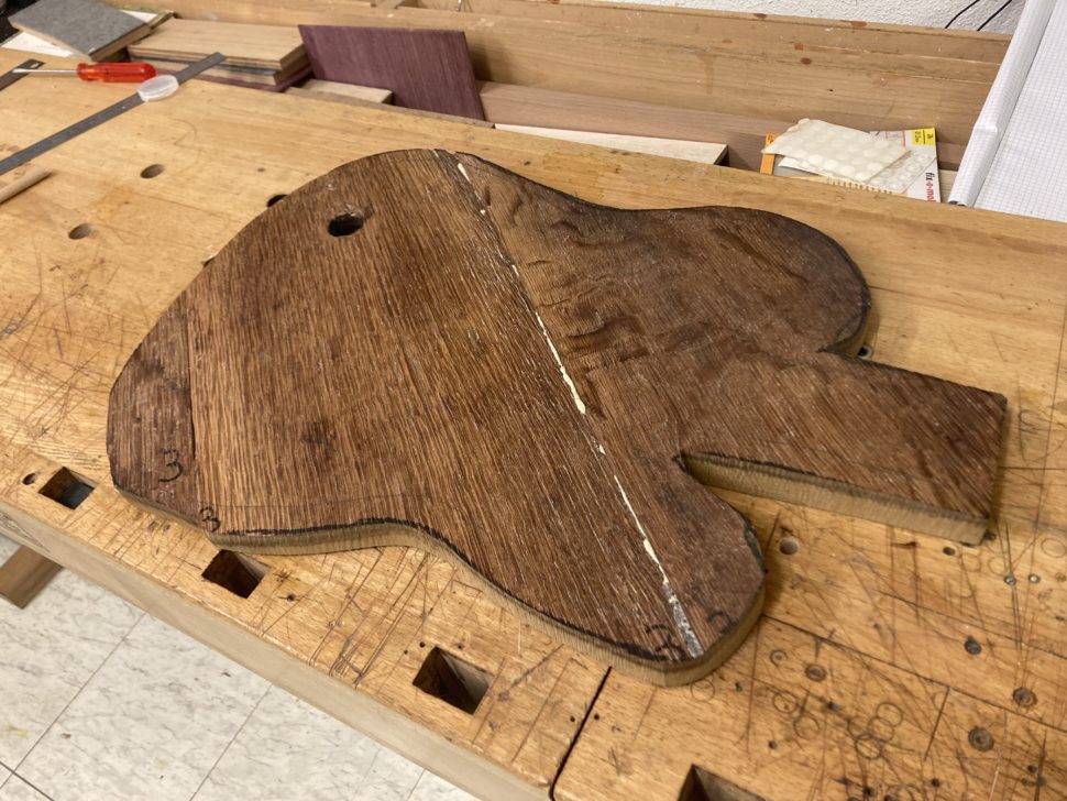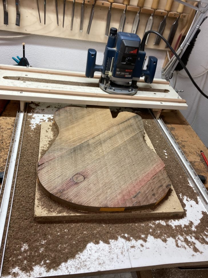 Lorsque mon ami m’a présenté le projet, j’avais des doutes. Les plaques de chêne étaient fortement déformées, les assembler paraissait un exercice peu adapté à la lutherie. Pire, leur maille grossière laissait craindre qu’elles ne supporteraient pas l’usinage. En commençant à travailler sur la guitare, pourtant, j’ai compris que ces difficultés faisaient partie de l’instrument que nous voulions créer, de son âme. Chaque imperfection est devenue un défi. Et j’avais d’autant plus à cœur de les relever que le projet avait à la base été lancé par deux frères. L’un d’eux nous a malheureusement quittés. Il s’agissait d’honorer sa mémoire.