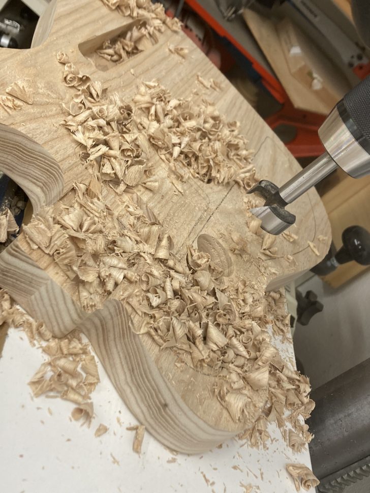 Le chêne du foudre a constitué la table de la guitare. La partie principale du corps, elle, a été réalisée avec un frêne des marais, issu de ma propre cuvée spéciale. Pour éviter que la guitare ne pèse aussi lourd qu’une Les Paul, j’ai chambré le bois, comme un grand Bordeaux. Pour établir une harmonie de texture entre le chêne séculaire et le frêne, plus récent, j’ai texturé la maille du second avec une brosse métallique, ce qui lui a conféré un joli petit côté rustique. Et pour la touche finale, j’ai trempé le tout dans un bain d’excellents vins toscans pendant deux semaines – teinte grand cru assurée ! -, avec une finition huilée à pores ouverts.