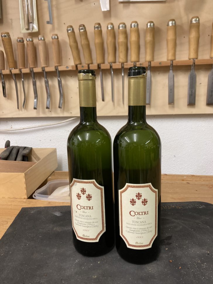 Cette guitare fait partie d’un duo d’instruments pas comme les autres, conçus à la demande d’un ami passionné de vins. Elle a été fabriquée à partir de la partie supérieure d’un foudre, ces grands tonneaux capables de contenir jusqu’à 2000 litres. Celui dont nous parlons a accueilli des crus d’exception pendant au moins 150 ans. Le bois en est imprégné pour toujours de tanins – et d’une belle teinte violacée. La deuxième guitare, à suivre, sera façonnée à partir du fond inférieur du tonneau.