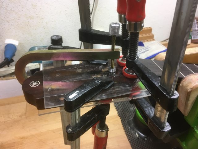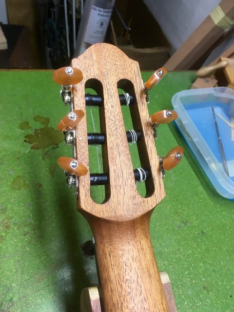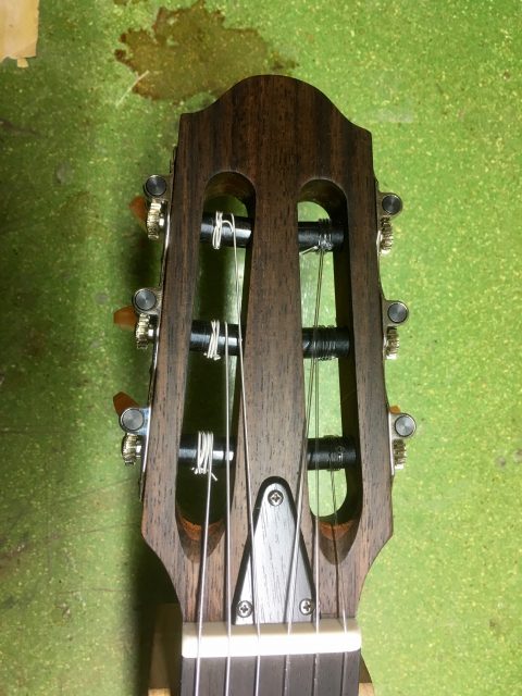 Pour réaliser ce collage, j’ai inséré dans la tête de la guitare, de fines tiges de carbone afin d’en renforcer la structure( non visibles), puis, j’ai confectionné une nouvelle plaque de tête en palissandre plus élégante que l’originale qui elle était en plastique imitation bois.